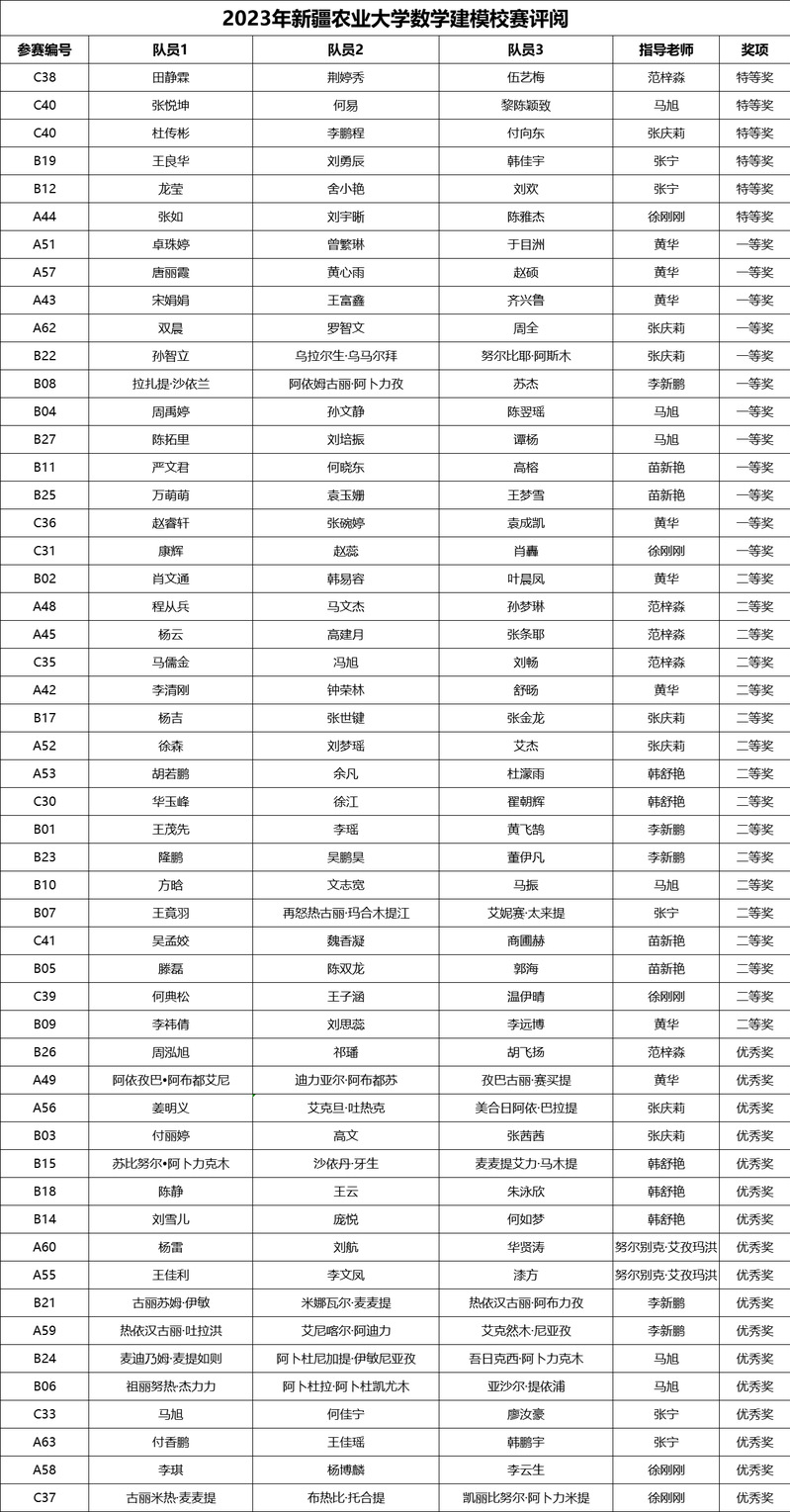 附:2023年新疆农业大学大学生数学建模竞赛获奖名单