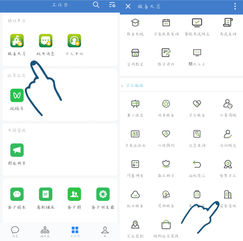1、进入企业微信,点击:工作台—服务大厅—宿舍管理