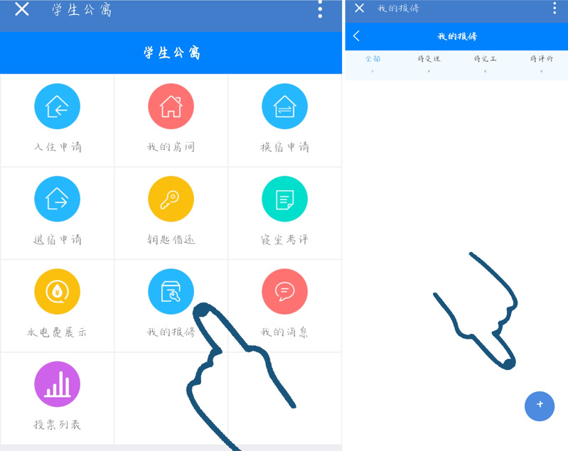 2、进入宿舍管理,找到“我的报修”点击右下角“+”号