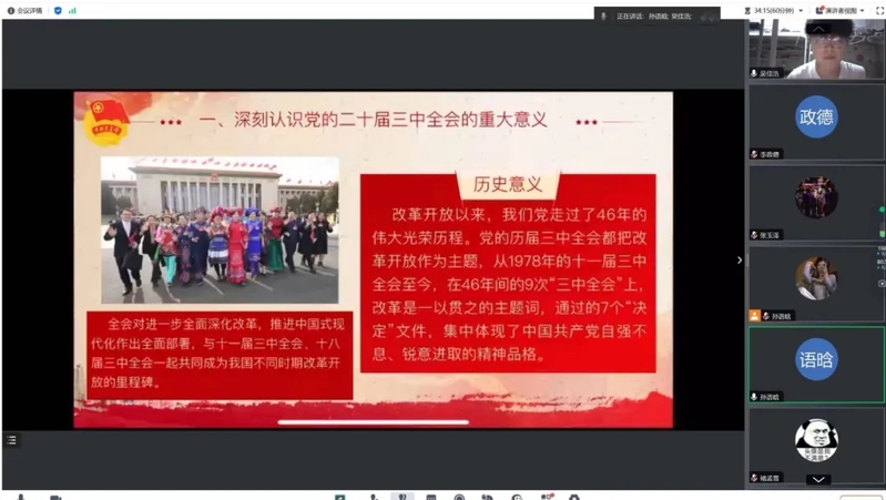 数学2201班团支书尹家欣介绍党的二十届三中全会的召开背景及重大意义,强调了全会在我国改革开放和现代化建设进程中的里程碑作用。她通过生动的语言和详实的资料,引导同学们回顾了改革开放以来我们党走过的光辉历程,特别是历届三中全会对于推动改革开放所起到的关键作用。