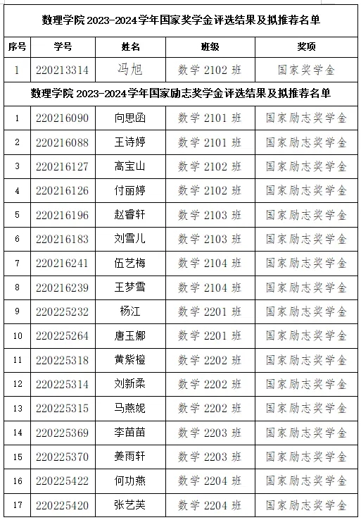 根据《新疆农业大学本专科生国家奖学金管理实施办法》要求,经学生个人申请、班级评议小组民主评议及推荐、非凡国际 公开评审、非凡国际 资助领导小组审核,现将审议通过的非凡国际 2023-2024学年国家奖学金、国家励志奖学金、自治区人民政府励志奖学金获得者名单及拟推荐人员公示如下。