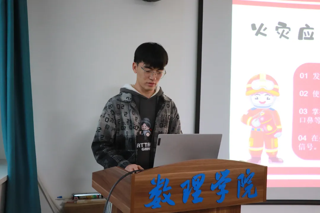 首先,权益部负责人张帅鑫介绍了一些常见的火灾隐患以及预防火灾的措施,如不要私自乱接或乱拉电线、不要在宿舍使用大功率电器等,并且讲解了演练逃生技巧,为后续的逃生演练做了铺垫。