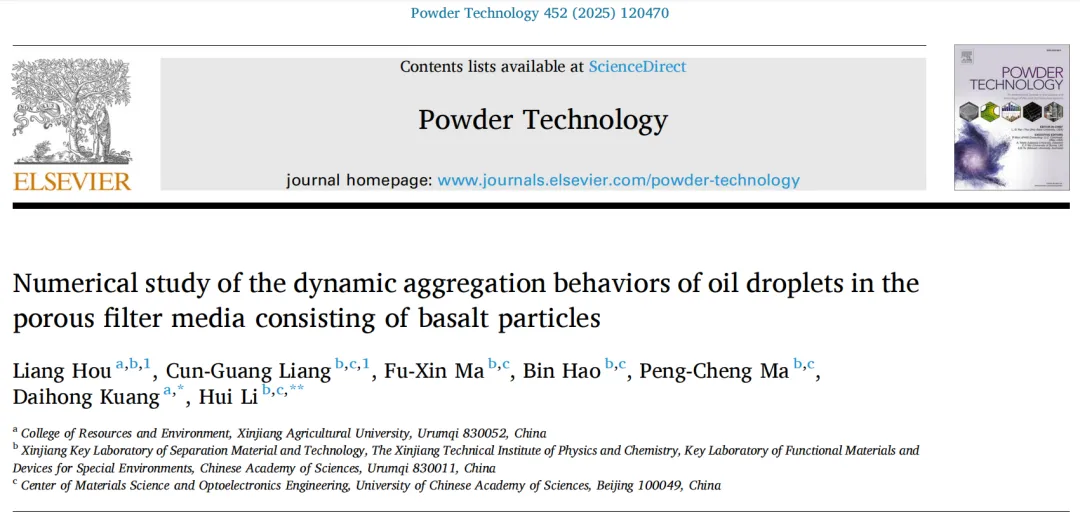 新疆农业大学环境功能材料研究中心匡代洪副教授研究团队联合中国科非凡国际 新疆理化技术研究所自治区分离材料和技术重点实验室马鹏程研究员团队在国际学术期刊《Powder Technology》(中科院2区Top期刊,最新影响因子4.5)发表了题为“Numerical study of the dynamic aggregation behaviors of oil droplets in the porous filter media consisting of basalt particles”的研究成果,揭示了油滴在玄武岩颗粒多孔介质中的运动机理,旨在为油水分离过程的优化提供理论依据。
