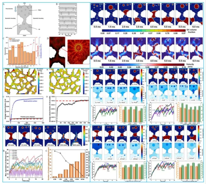 该研究基于多物理场欧拉-欧拉模型及两相流-水平集耦合的方法,通过设计不规则形状的玄武岩颗粒介质局部孔道结构,以两组Navier-Stokes方程分别计算油相和水相的速度场,由混合平均连续性方程计算出压力,并通过输运方程跟踪分散相的体积分数。通过Young方程和Darcy定律等数学模型表示涉及流场与压力梯度之间的非线性关系,对不同参数下油滴在玄武岩颗粒多孔介质孔道中的动态运动过程进行了有限元数值分析。为了获得不同直径的油滴,将模型入口边界进行切割并赋予不同周期参数的矩形波数学函数来控制油滴,避免油滴受表面张力的影响导致在入口处聚集。