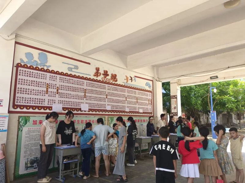 “老师,我(我家小孩)可以报名吗?”在家长和小朋友的一声声询问中,招生开始。熙熙攘攘的人群夹杂着听不懂的方言、炎热的天气也烘托了支教小组的热心。