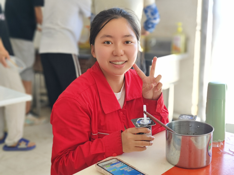 数学2302班薛美琳,是在灌装岗位上收集成品的“美少女战士”。8月14日被车间评为“今日安全之星”。她说:“当我怀着一颗既激动又充满期待的心,踏入那片充满番茄酱香气的工厂,开始我的耕读教育之旅时,我仿佛打开了一扇新世界的大门。在这里,我不仅亲眼见证了番茄酱从原料到成品的每一个细致环节,更在实践中深刻理解了书本上的理论知识是如何在现实中绽放出璀璨的光芒。来这里的第一周分配在夜班,当大多数人沉浸在梦乡之时,我却站在生产线旁,见证着夜的深邃逐渐淡去,迎来黎明的第一缕曙光。那一刻,心中涌动的不仅仅是疲惫过后的释然,更多的是一种难以言喻的成就感——我,竟然真的做到了,在这十二个小时的夜班中,我坚持了下来,并且做到了最好。”在耕读教育实践中,她不仅掌握了安全、高效地操作各类工具与设备的技能,显著提升了个人动手能力。更重要的是,这段经历让她从心底深处领悟到了在“三农”问题中新时代青年的责任与义务,以及不懈奋斗对于实现个人价值与社会贡献的至关重要性。这份体验,无疑将成为她人生旅途中一段难忘且意义非凡的篇章。
