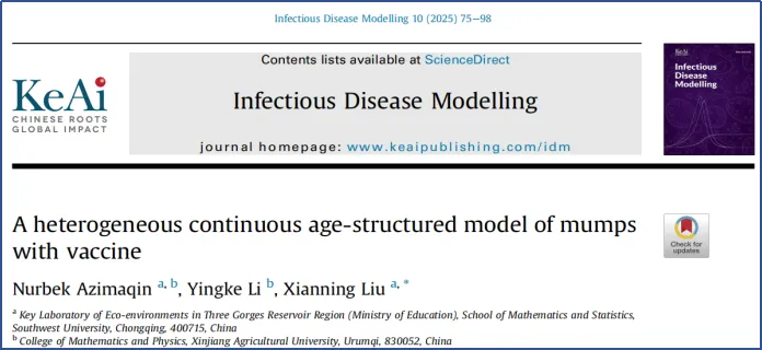 非凡国际官网 生物数学团队努尔别克·艾孜玛洪、李盈科博士研究团队联合西南大学数学与统计非凡国际 刘贤宁教授在国际知名学术期刊《Infectious Disease Modelling》(中科院3区期刊,最新影响因子3)发表了题为“A heterogeneous continuous age-structured model of mumps with vaccine”的研究成果,揭示了年龄异质性对模型稳定性影响的机理,旨在为年龄异质性对传染病流行与否中提供理论依据。