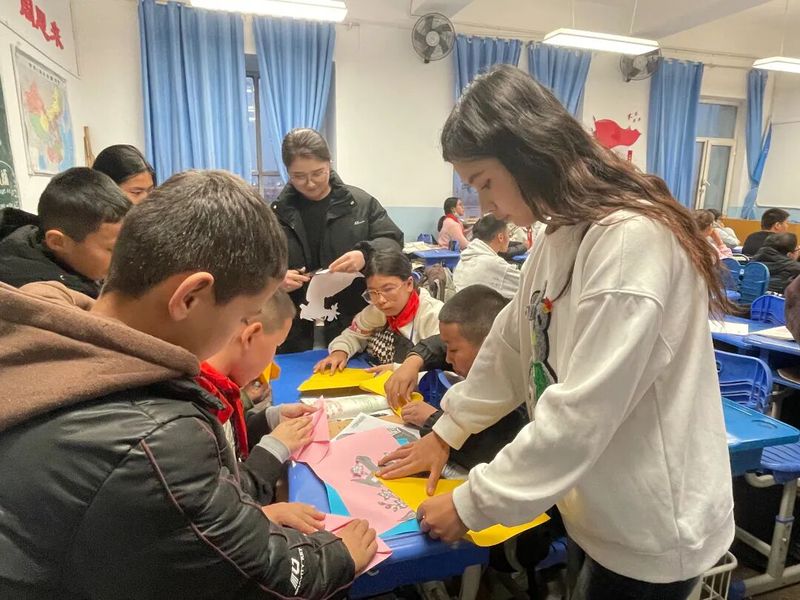 支部学生党员在支教沙雅县第四中学开设非遗剪纸课堂,现场授艺,紧扣 “红色记忆”“民族团结” 主题,带领学生剪裁 “石榴籽紧抱” 纹样、民族团结字样及各民族手牵手图画等,与孩子们共同完成剪纸创作。剪纸课后,以 “展风采・聚合力” 为主题的羽毛球娱乐赛如期开展,党员支教老师秉持 “友谊第一、拼搏争先” 的精神,与小朋友自发组队互动,耐心引导孩子们掌握击球技巧,场边支教学生组成加油方阵,在互动中拉近了与支教学生的距离。